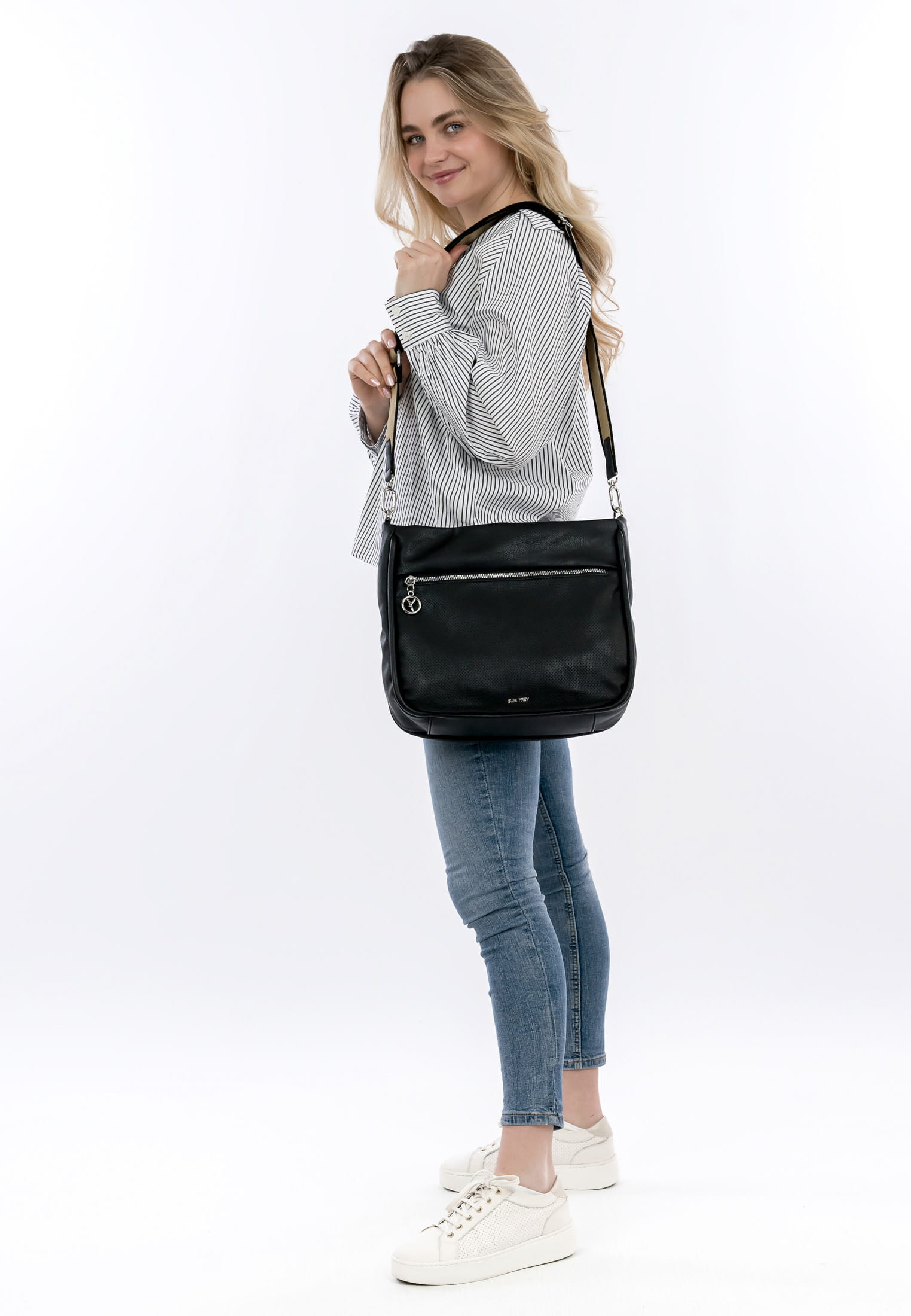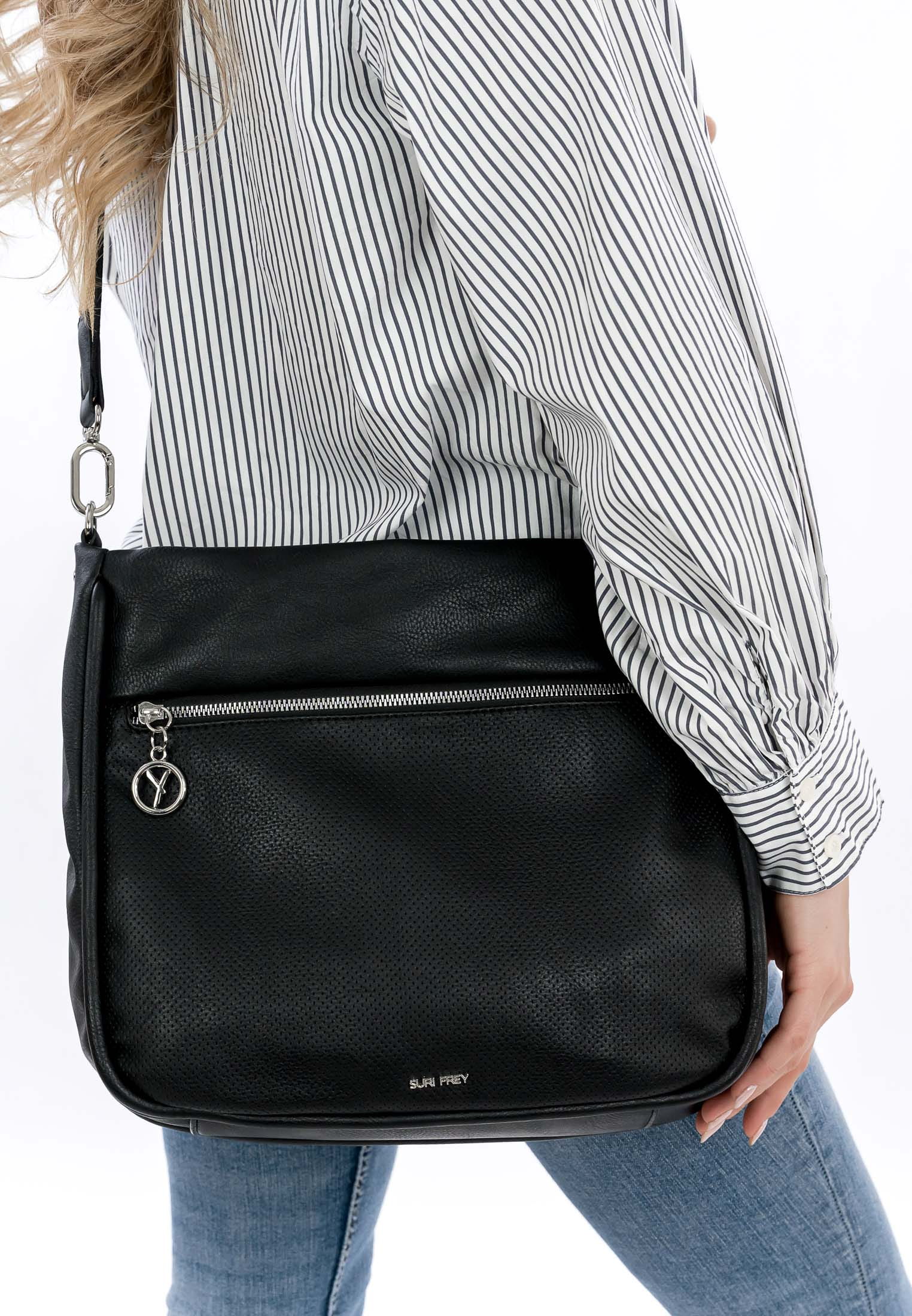 Wenn wir auf Achse sind, wollen wir uns rundum wohlfühlen. Wir bei SURI FREY haben genau die Accessoires, die unseren Kundinnen so gut gefallen. Unser Beutel hat übersichtliche Hauptfächer. Dank eines Rückfaches mit Reißverschluss hast Du weiteren Stauraum und leichten Zugriff auf alle relevanten Dinge. Dank der weichen Haptik schmiegt sich Dein neuer Beutel der Serie SFY Patsy angenehm an. Single Lettering schmückt optisch und hebt das besondere Design dieses neuen Favoriten hervor. Mit einem angenehmen, längenverstellbaren und abnehmbaren Umhängeriemen und dem abnehmbaren Tragegriff wird der neue Lieblingsbegleiter ganz locker und entspannt über der Schulter getragen. Dank der verschiedenen Tragevarianten ist dieses Modell so wandelbar wie Dein Alltag und fügt sich perfekt in jede Situation ein. Handy, Portemonnaie und eine Powerbank - mit dem hübschen Beutel hast Du einfach immer alles dabei. Ach und sogar das Mitbringsel für die Gastgeber der netten Party passt hier locker rein.